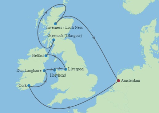 Begin with time in Amsterdam, then explore the stories and landscapes of Ireland, England, Scotland, and Wales. Wander the colourful streets of Cobh, stroll the harbour at Dún Laoghaire, and take in coastal beauty at Holyhead in Wales.