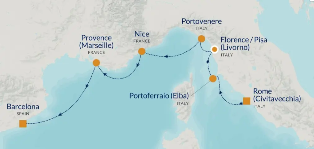 Continue by sea aboard the Azamara Onward, sailing to destinations including Elba, Tuscany, and Portovenere, where colourful harbours, scenic coastlines, and charming villages shape daily life along the Mediterranean. Step ashore in historic ports and take in everything from Renaissance treasures to quiet seaside streets shaped by centuries of history.